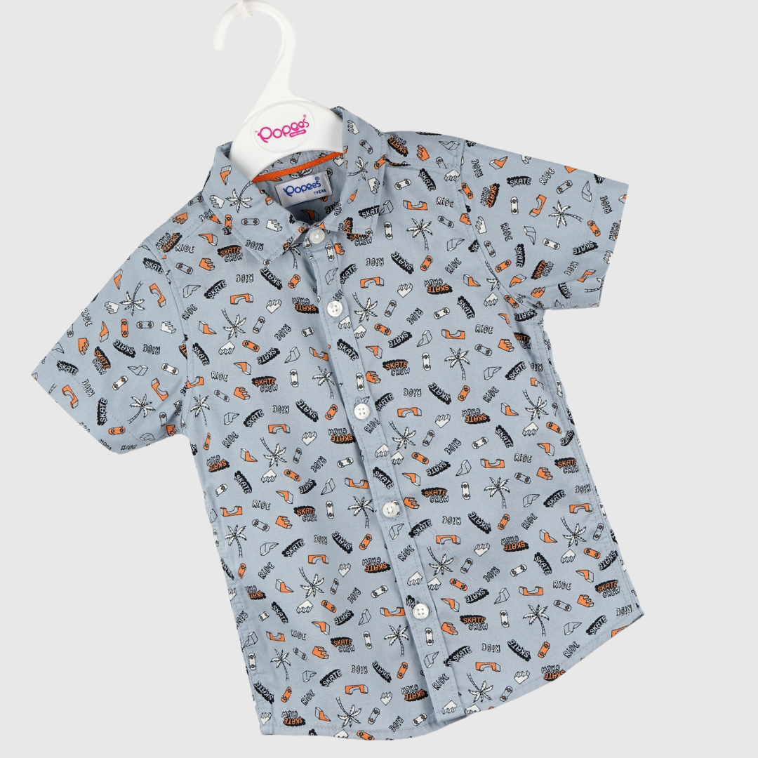 Are you looking for the perfect addition to your little boy's wardrobe? This adorable boys' collared shirt is a must-have! Featuring a charming skateboard, cute palm trees and graffiti print, this stylish greyish-blue shirt is fun and versatile, making it suitable for various occasions.