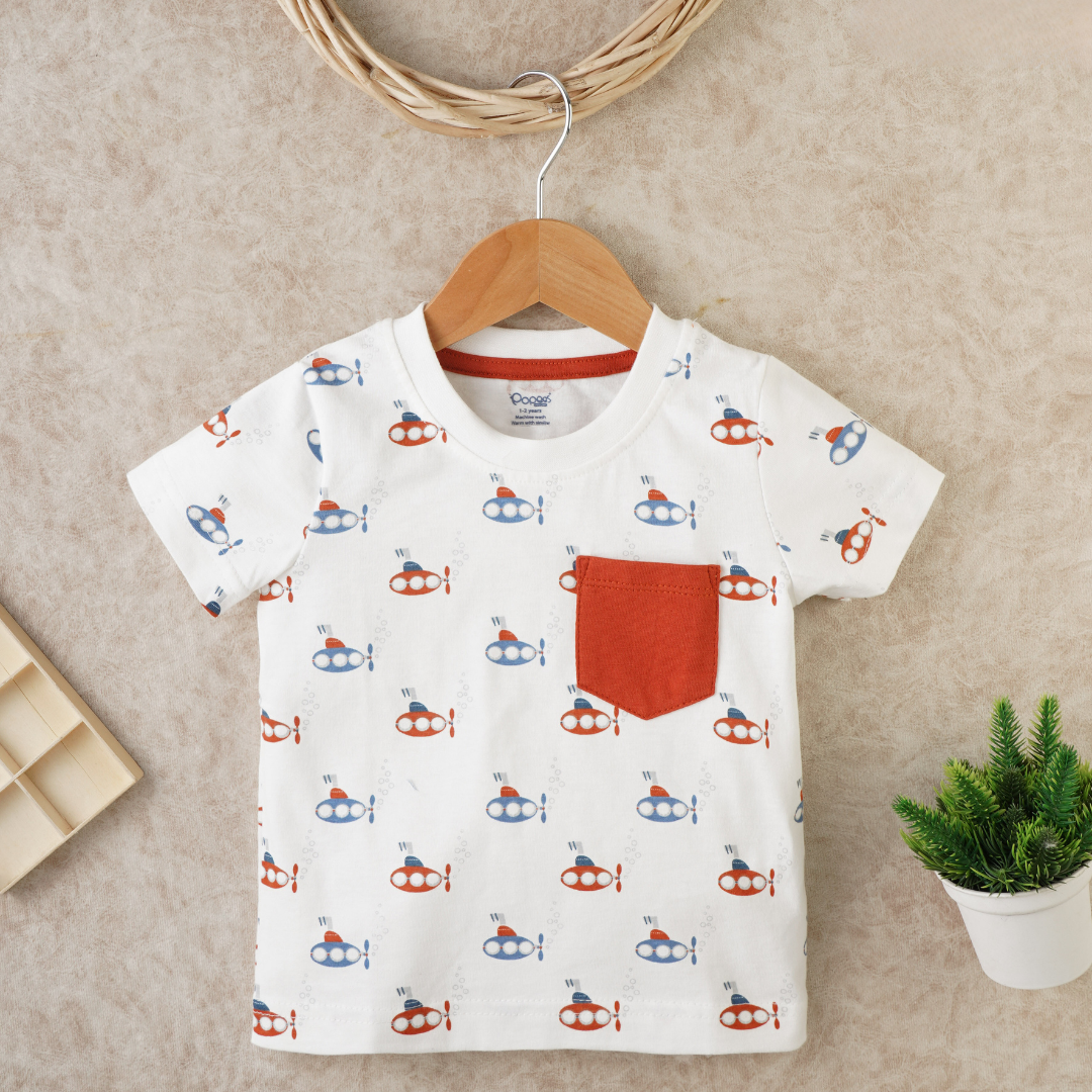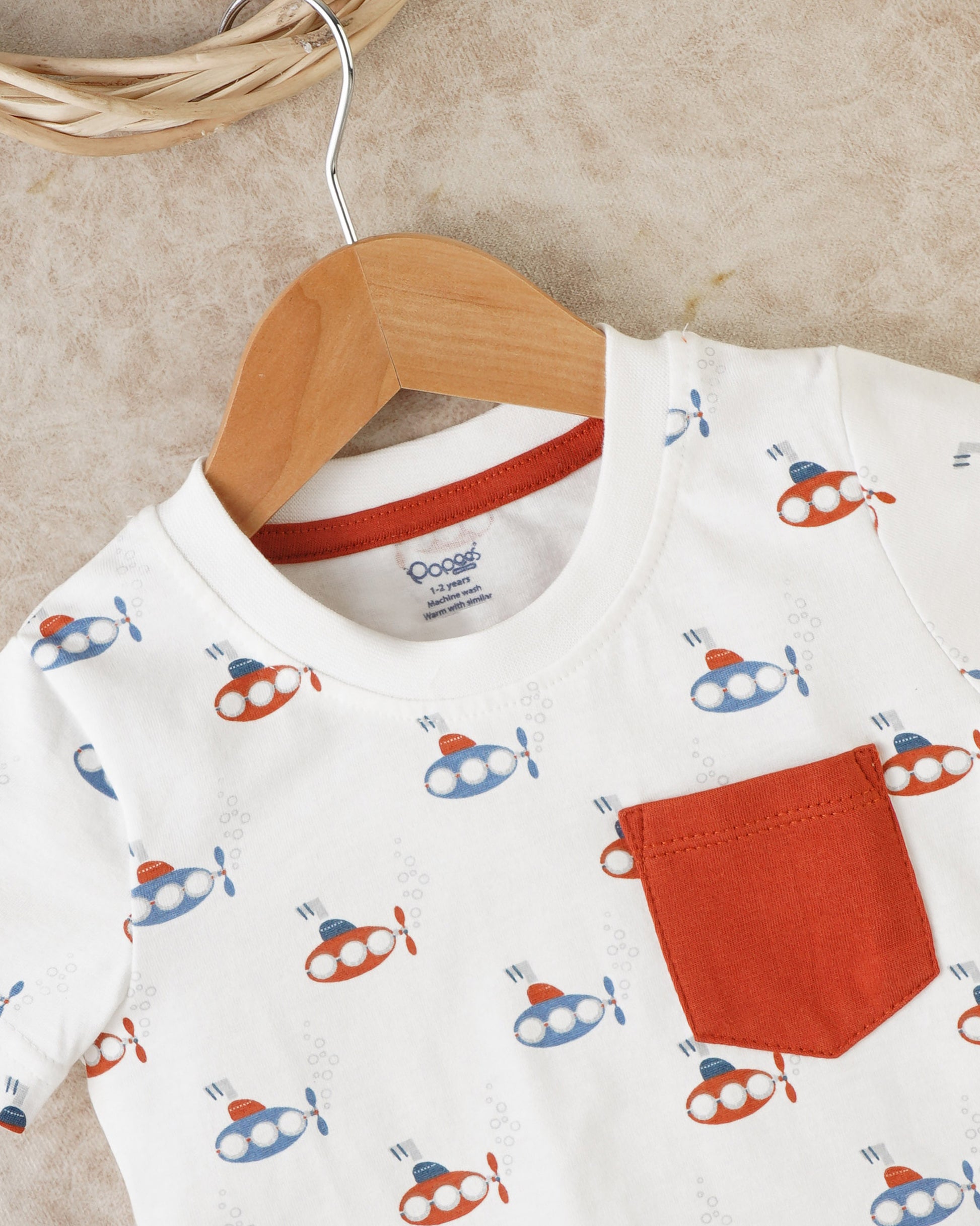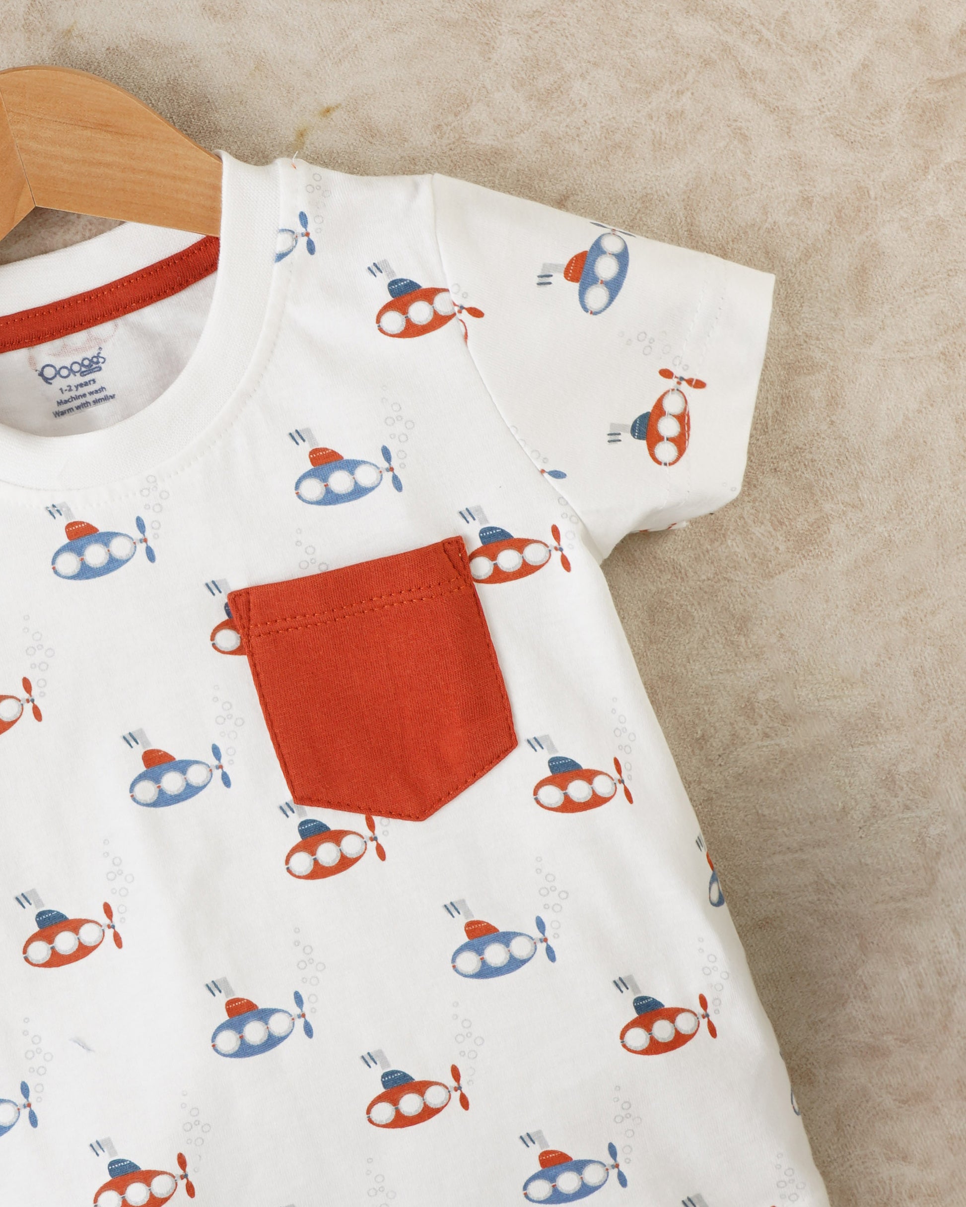 Gear up your little explorer in white cotton t-shirt adorned with playful submarine prints. Whether he's navigating indoor adventures or embarking on outdoor escapades, this lightweight and breathable t-shirt ensures comfort and style. Crafted with natural dyes that are gentle on young skin, it's an ideal choice for everyday wear. Elevate his wardrobe with this charming piece that sparks imagination and adventure. Order now to bring a touch of underwater excitement to his outfits!
